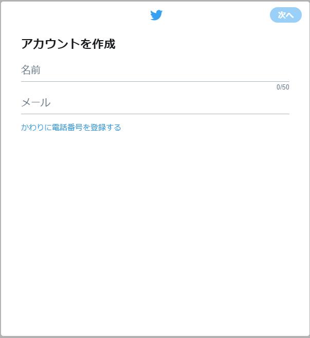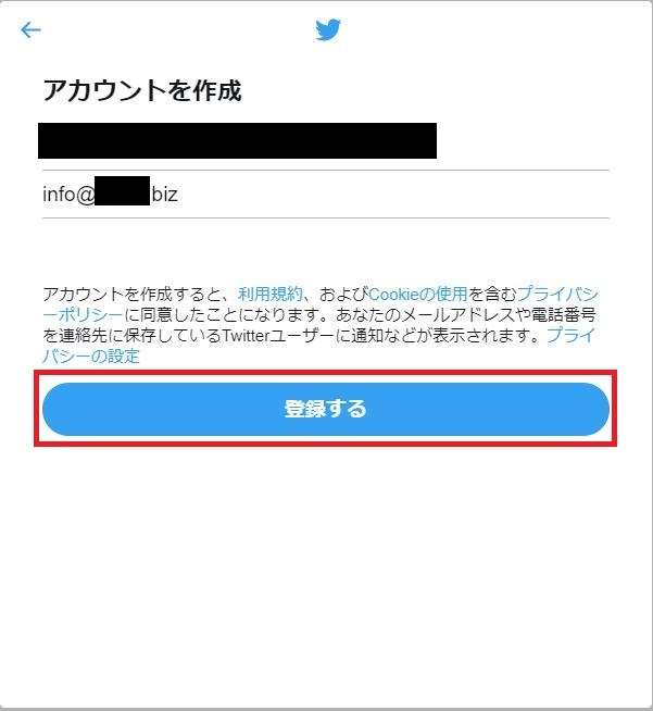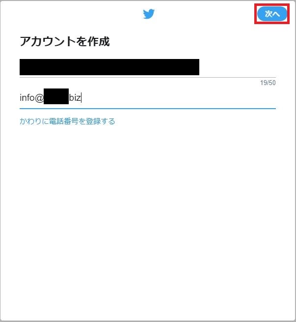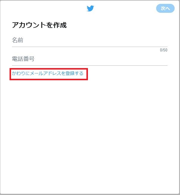 Twitterのアカウントの名前とメールアドレスを入力します。