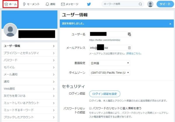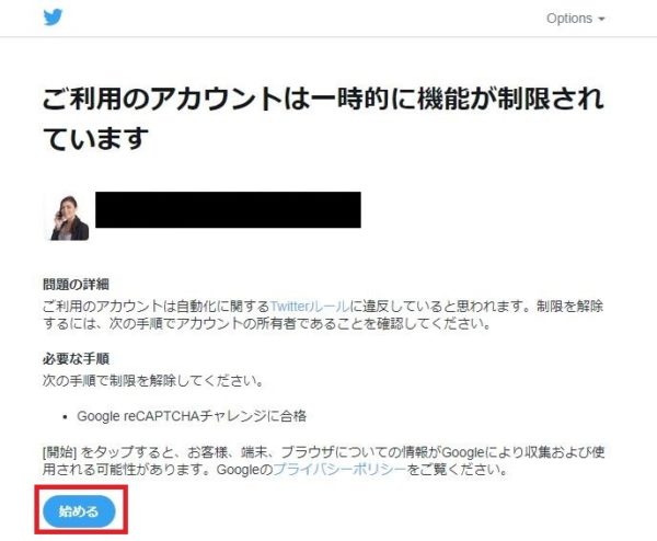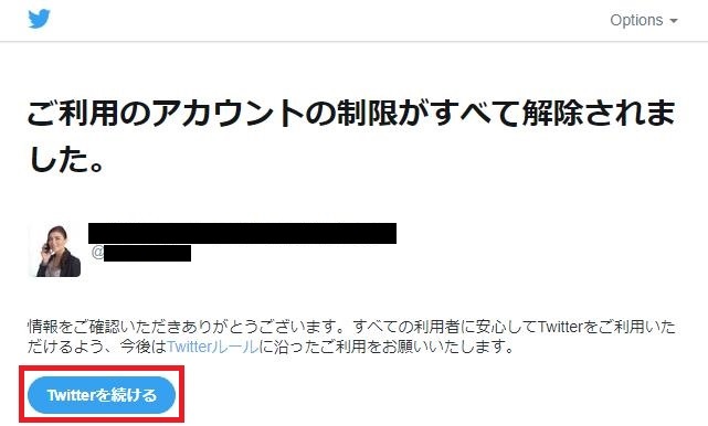 制限が解除されたので、赤枠で囲った「Twitterを続ける」ボタンをクリックします。
